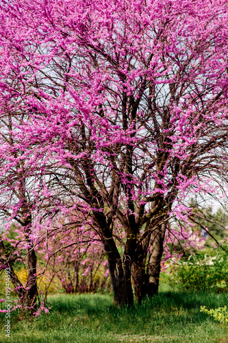 © Yevhenii, Obraz premium Sakura Cherry pink color and buds on a blurred background. A picnic on the grass in the garden under blooming pink cherry trees. Spring background, Japan