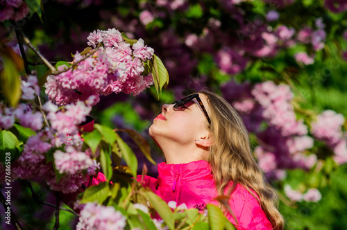 Fototapeta premium Sakura tree blooming. Small girl child in spring flower bloom. Enjoy smell of tender bloom. Sakura flower concept. Gorgeous flower and female beauty. Natural cosmetics for skin. Girl in cherry flower