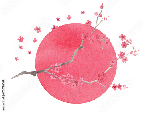 © Nataliia, Naklejka premium Sakura with the sun on a background. Watercolor handmade illustration. For fabric, wallpaper, greeting cards, design, decoration and illustration.