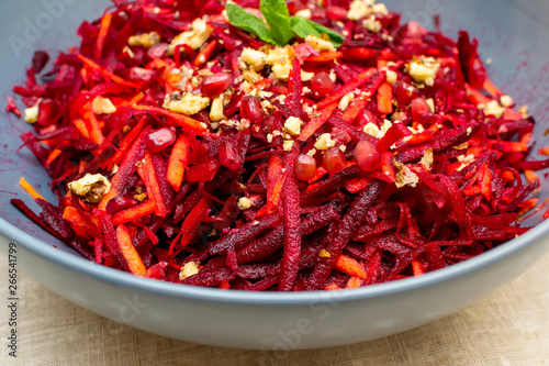 Fototapeta premium Salad of grated red beets carrots pomegranates and walnuts