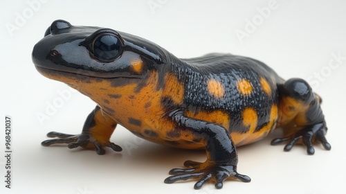 © sa-photo, Obraz premium Salamander crawling on a white background, showcasing its smooth, wet skin