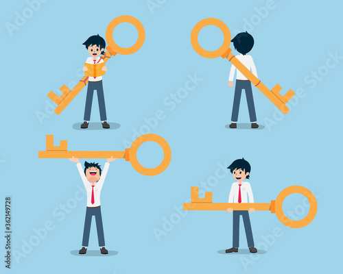 Obraz premium Salary Man With a giant key, holding the key, lifting the key and carrying...