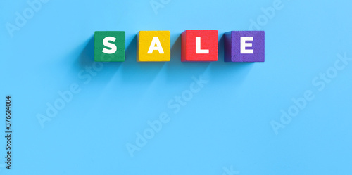 Obraz premium Sale word on multicolored wooden cubes on blue background