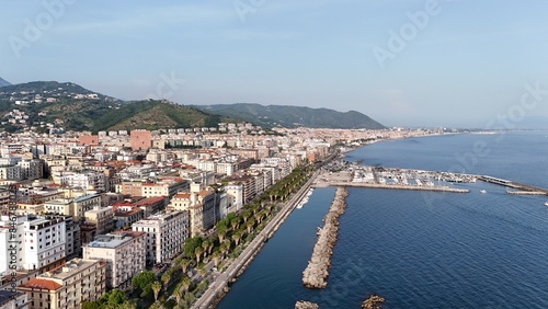 © Giuseppe Picciocchi, Obraz premium Salerno, in Campania, is famous for the stunning Amalfi Coast. It offers breathtaking views of the Tyrrhenian Sea, beautiful beaches, and a lively promenade, perfect for scenic walks