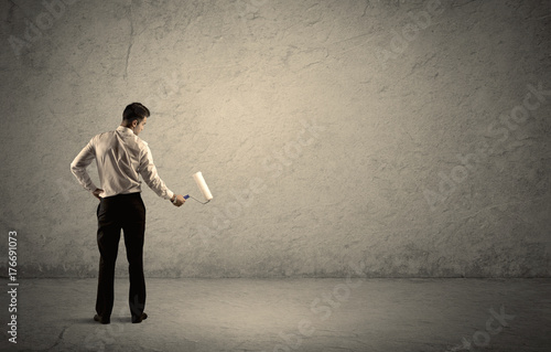 © ra2 studio, Obraz premium Salesman with roller standing at empty wall