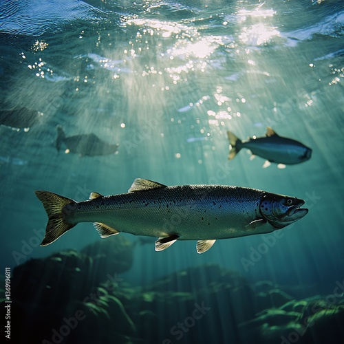 Naklejka premium Salmon are anadromous fish, meaning they're born in freshwater, spend most of their lives in the ocean, and then return to freshwater to spawn. They're known for their impressive migrations, swimming