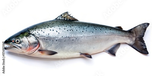 Naklejka premium Salmon fish isolated on white background for seafood steak BBQ food concept, salmon, fish, isolated, white background, seafood, steak