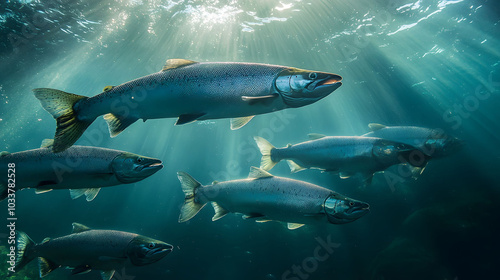 Obraz premium Salmon Schooling in Ocean Waters, vibrant aquatic scene showcasing the...