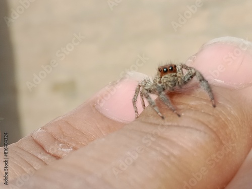 © Zain, Obraz premium Salticidae or brown and hairy surface jumping spider.Salticidae body pattern