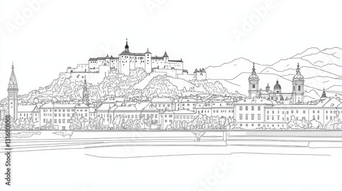 © LittleDuck, Fototapeta premium Salzburg Cityscape Line Drawing - Line drawing illustration of Salzburg, Austria, featuring Hohensalzburg Fortress and the city's architecture. A picturesque, detailed sketch