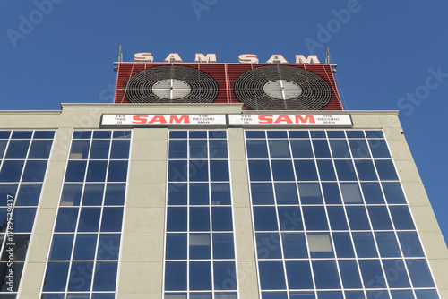 © eugen, Naklejka premium Sam the Record Man sign installed atop 277 Victoria St, facing Sankofa Square, Toronto