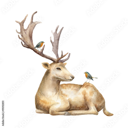 © Leyasw, Obraz premium Samiec jelenia z ptakami Robin. Akwarela ilustracja. Na białym tle