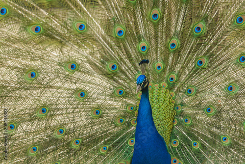 Obraz premium Samiec paw pokazując swoje pióra ogona.