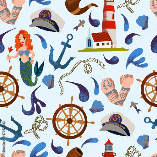 © Yumeee, Naklejka premium Samless pattern with sea elements such as mermaid, wave, anchor, lighthouse and other. Vector.