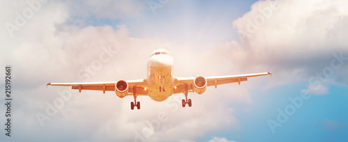 Fototapeta premium samolot do lądowania na tle błękitnego nieba z białymi chmurami. Widok...