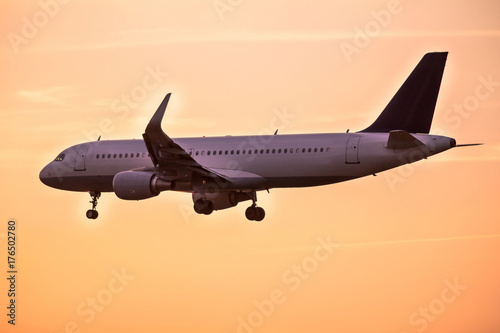 Fototapeta premium Samolot do lądowania o zachodzie słońca