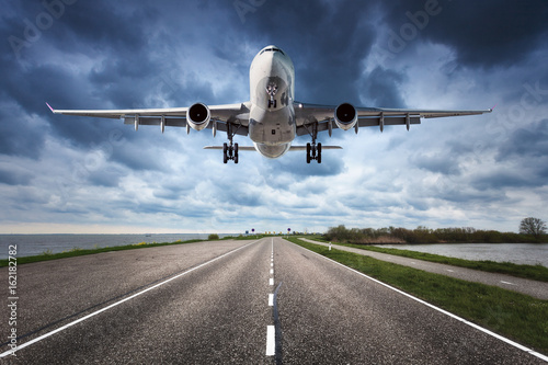 Fototapeta premium Samolot i droga. Krajobraz z dużym białym samolotem pasażerskim leci w...