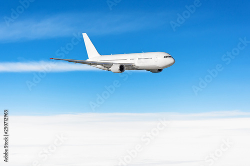 © aapsky, Obraz premium Samolot leci w widoku cloudscape błękitne niebo.