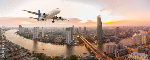 © kinwun, Naklejka premium Samolot startuje nad panoramą miasta o zachodzie słońca