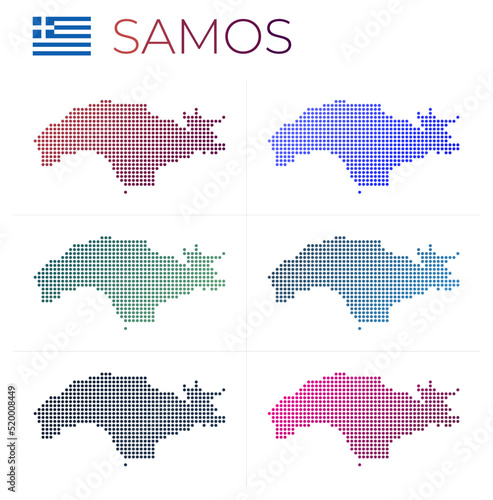 © Eugene Ga, Naklejka premium Samos dotted map set. Map of Samos in dotted style. Borders of the island filled with beautiful smooth gradient circles. Trendy vector illustration.