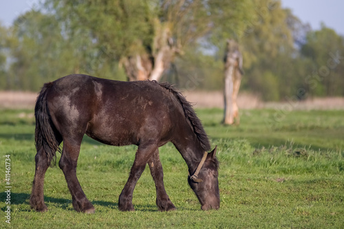 © Monika, Obraz premium Samotny koń na łące w świetle zachodzącego słońca