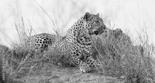 © Alta Oosthuizen, Obraz premium Samotny lampart położył się na mrowisku w naturze podczas dziennej artystycznej przemiany
