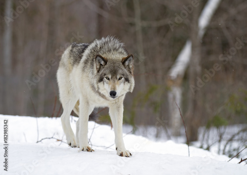 © Jim Cumming, Naklejka premium Samotny wilk leśny lub wilk szary (Canis lupus) spacerujący po śniegu w Kanadzie