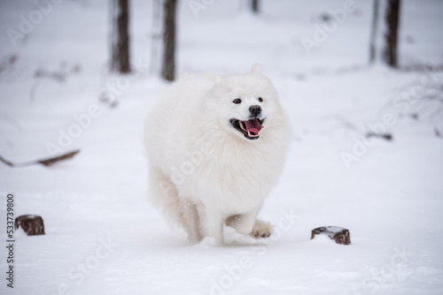 © zanna_, Obraz premium Samoyed white dog is running on snow outside