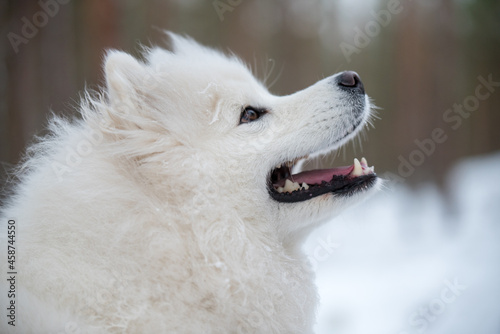 Obraz premium Samoyed white dog portrait closeup is in the winter forest