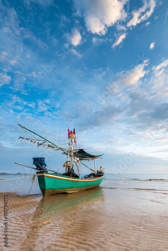 Fototapeta premium Samroiyod Beach, fishing boat parked on beach, background is blue sky