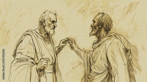 © T Studio, Fototapeta premium 1 Samuel 28 Biblical Illustration: Saul's consultation with Endor medium, Samuel's spirit, prophecy of defeat and death, Beige Background, copyspace