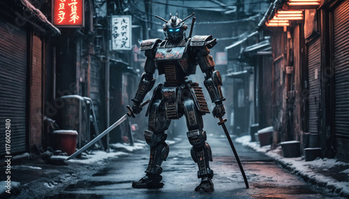 © Miklos, Fototapeta premium Samurai robot stands in a snow-covered alleyway under neon lights at night