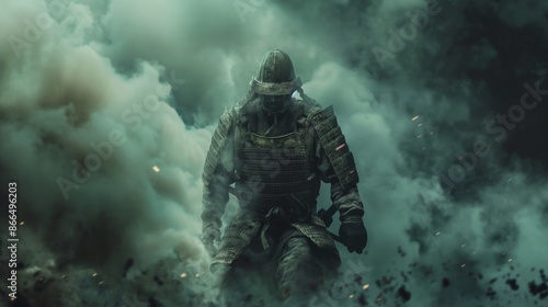© Sol Revolver Group, Fototapeta premium Samurai Warrior Emerging from Smoke in Dramatic Scene