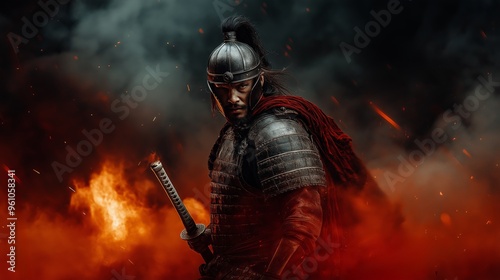 © HanThar Fusion, Naklejka premium Samurai Warrior in Armor Holding Katana Amidst Dark Smoke