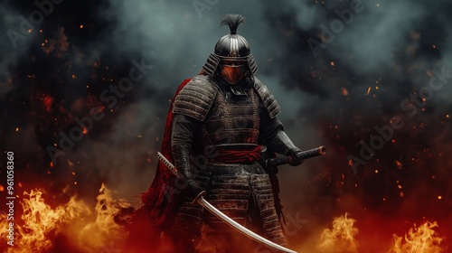 © HanThar Fusion, Naklejka premium Samurai Warrior in Armor Holding Katana Amidst Dark Smoke