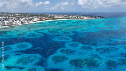 © bydronevideos, Obraz premium San Andres Skyline In San Andres Providencia Y Santa Catalina Colombia. Turquoise Water Caresses Tropical Beach In A Caribbean. Shore Clouds Sky Beach Sea. Seaside Panorama.