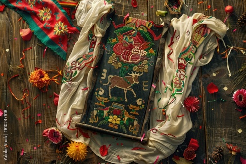 © O, Naklejka premium San Fermin festival display with red scarves, traditional white clothing, and bull running symbol on wooden background