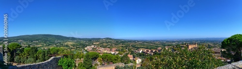 © Massimo Parisi, Obraz premium San Gimignano, Italy, Tuscany region. August 14 2016. Landscape seen from the top of San Gimignano towards the valley. Green hills alternate with vineyards and fields cultivated in the countryside.
