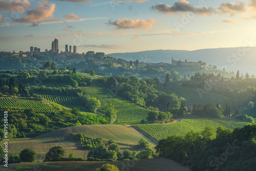 Fototapeta premium San Gimignano medieval towers and vineyards at sunset, Tuscany, Italy