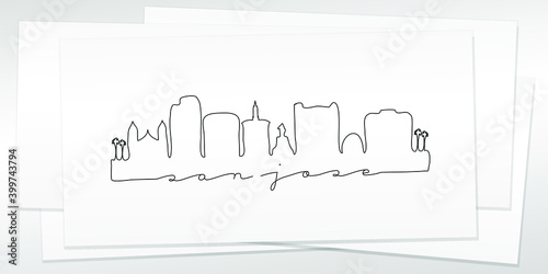 © josepperianes, Naklejka premium San Jose, CA, USA Doodle Skyline Hand Drawn. City One Line Art Illustration Landmark. Minimalistic Sketch Pen Background.