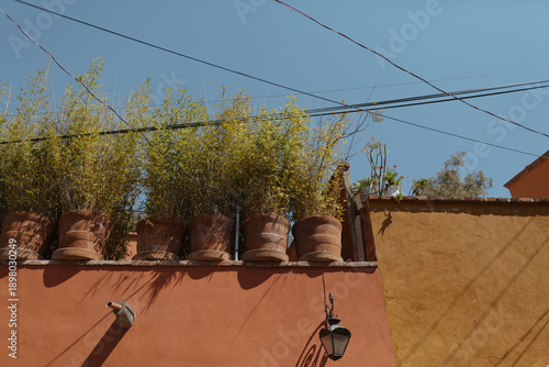 Naklejka premium San miguel de allende adobe architecture with potted bamboo plants