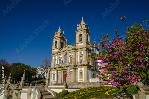 Obraz premium Sanctuary of Bom Jesus do Monte with a flowering tree under a blue sky