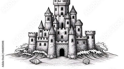 © Lang, Obraz premium sand castle sketch engraving vector illustration T-shirt apparel print design Scratch board imitatio