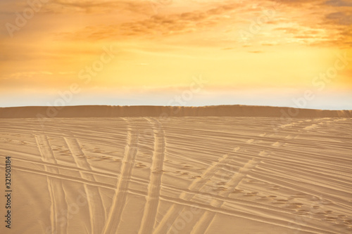 Naklejka premium Sand Dunes full off vehicle tracks leaving three distinct paths forward....