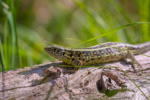 © Sander Meertins, Naklejka premium Sand lizard, Lacerta agilis, green male