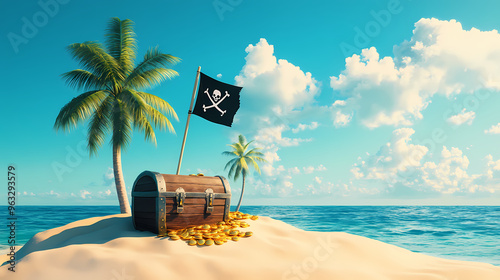 Fototapeta premium Sand, sea, sky, clouds, palm trees and summer day. pirate island, chest of gold and pirate flag fluttering in the wind. 3d rendering. Pirate. Illustration