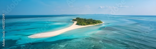 © DawoodJan, Obraz premium Sand spit of a tropical island stretching into the distance. Beautiful sunny summer landscape with white sand beach