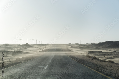 © Lukas, Fototapeta premium Sand Storm Across Lonely Desert Road in Southern Namibia taken in January 2018