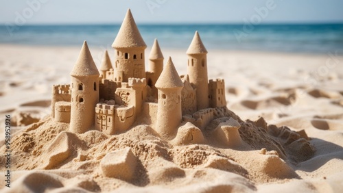 Naklejka premium Sandcastle standing on a sunny beach by the ocean