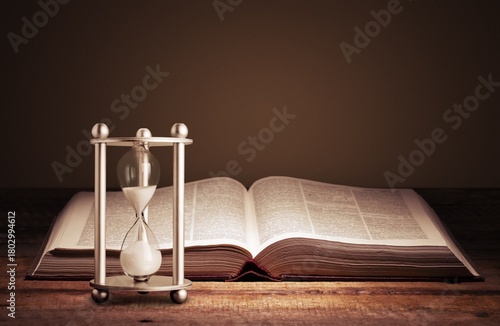 © BillionPhotos.com, Naklejka premium Sandglass with ancient book. History concept